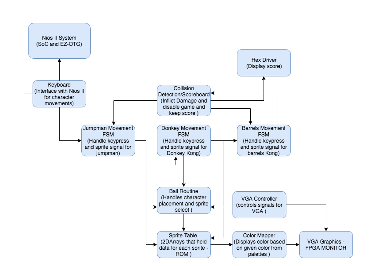 Goal: Emulate a modified version of the original 1981 Donkey Kong on the FPGA board by integrating RTL and System-on-Chip (SoC) with USB and VGA Interface.