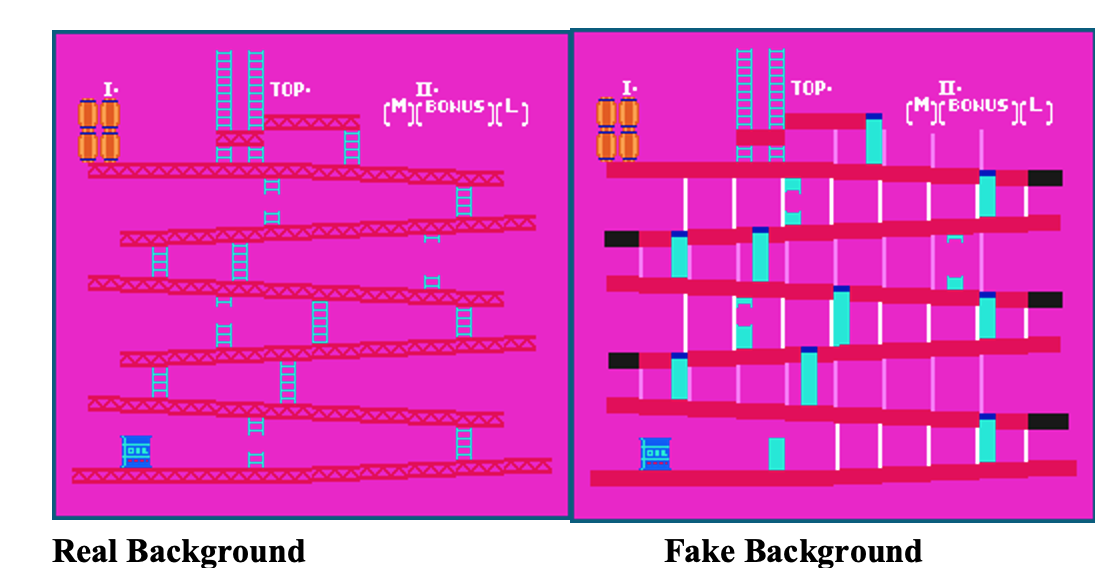 Angled Platforms and Background Detection: The platform on which Jumpman stands is not always a constant height thus I had to come up with a way to make him rise up when he gets to the next step. My solution was to make a fake background that marks each step(white vertical lines) and when Jumpman crosses the marker his direction in the y-axis is decremented by a pixel. Going down the platform is handled by gravity. A similar method was also implemented for going up ladders and going down ladders. When up is pressed, Jumpman can only go up if he is in front of the teal color and he can only go down a ladder if his foot is standing on dark blue. If his foot is on the color black then gravity takes effect. Jumpman movements effectively were governed by the fake background but the real background was the one drawn.